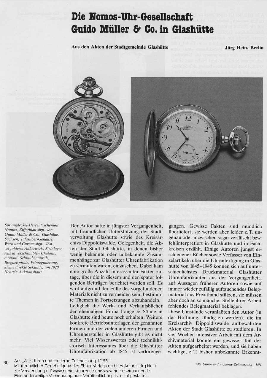 Die NOMOS Uhr Gesellschaft Guido Müller & Co. in Glashütte von Jörg Hein Jörg Hein hat Ende der 80er Jahre in dem Stadtarchiv der Stadt Glashütte, das bei der Kreisverwaltung in Dippoldiswalde lagern, einige Recherchen zur Glashütter Uhrenindustrie angestellt. Dabei ist auch ein Artikel über die "alte" NOMOS entstanden. Dieser Artikel wurde Ende der 80er in der damaligen DDR veröffentlicht. Das Westdeutsche Uhrenmagazin "Alte Uhren und moderne Zeitmessung" hat den Artikel in der Ausgabe 1/1991 abgedruckt. Bei meinen Recherchen rund um NOMOS bin ich auf dieses Magazin gestoßen und konnte mir ein Exemplar besorgen. Ich habe mich dann mit dem Ebener Verlag und dem Autor Jörg Hein in Verbindung gesetzt und darum gebeten, diesen Artikel hier zur Verfügung stellen zu dürfen. Herr Pfeiffer-Belli vom Ebener Verlag und Herr Hein haben mir die Erlaubnis hierzu erteilt. Ich möchte mich nochmals im Namen der ganzen NOMOS Fangemeinde bei beiden für die freundlichen Gespräche und die Möglichkeit, diese Informationen hier bereitzustellen bedanken.